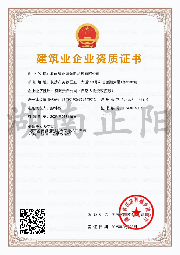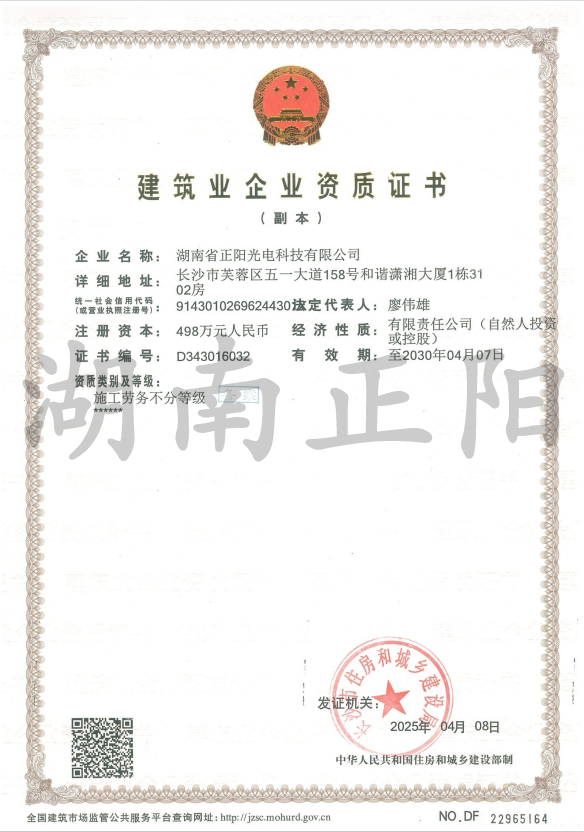 2025年4月8日,經長沙市住房和城鄉(xiāng)建設局審核批準,湖南省正陽光電科技有限公司成功獲得“施工勞務”資...